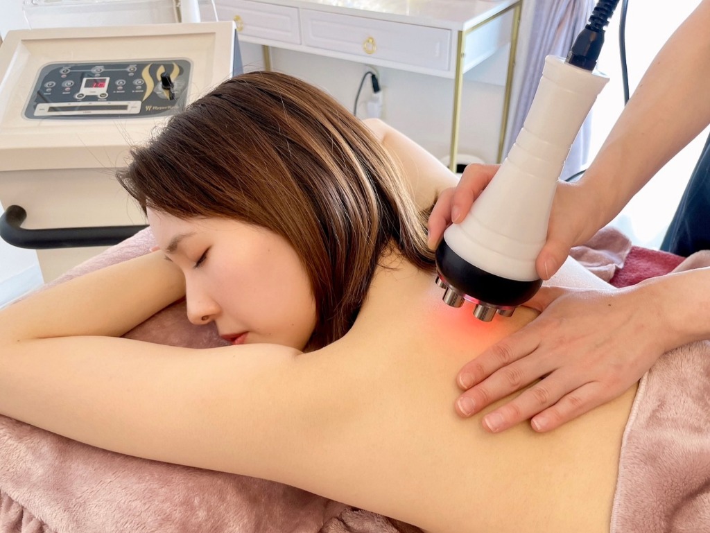 腕・お腹・背中・腰をハイパーナイフで皮下4〜5㎝の脂肪にしっかりアプローチした後、もう1台の痩身機器マジックポットでラジオ波とセルライト潰しでさらに脂肪を撃退し、ハンドマッサージで流して最後にヒートマットで大量発汗していきます。(初回120分カウンセリング・お着替え込み)